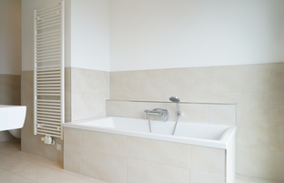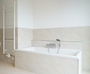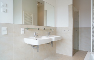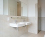 Das hell geflieste Badezimmer ist mit einer ebenerdigen Dusche sowie Badewanne, 2 Waschtischen, WC und Handtuchheizkörper ausgestattet.