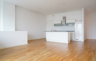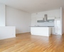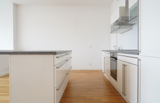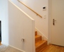 Eine stilvolle Treppe mit Echtholzbelag führt in die obere Etage, die ein offenes Wohnkonzept mit einer Deckenhöhe von ca. 2,95 m bietet und mit einer zeitgemäßen Einbauküche versehen ist. Der freundlich helle Wohn-, Ess- und Küchenbereich sowie die Dachterrasse, die einen schönen Blick auf die begrünte Außenanlage bietet, gehen hier harmonisch ineinander über.