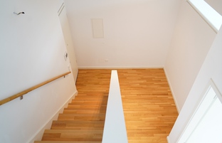 Auf der 1. Wohnebene befinden sich neben Eingang und Flur das Kinderzimmer sowie ein Tageslichtbad mit ebenerdiger Dusche. Die Deckenhöhe auf dieser Etage beträgt ca. 3,50 m. Zwischen Kinderzimmer und Flur sorgt ein Innenfenster für einen angenehmen Lichteinfall im Eingangsbereich.